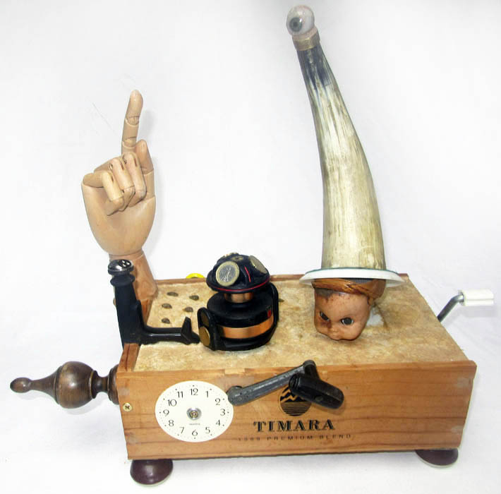 Assemblage with a wool-winder, 3 music boxes, and the reel from a fishing rod