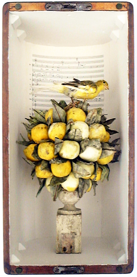 In an old Singer sewing machine cover, the stuffed bird sings on a leaden tree.